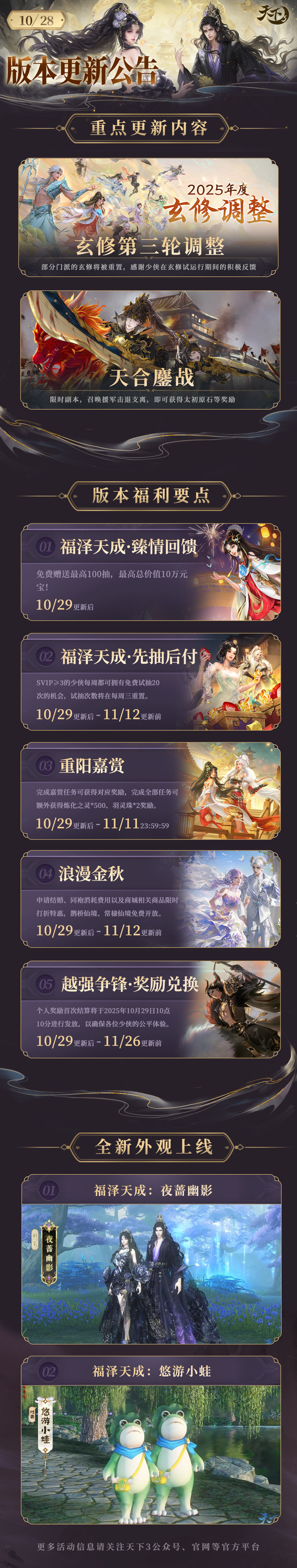 本周更新后,福泽天成活动 将携各类珍稀道具上线! 与此同时,珍品时装【夜蔷幽影】 坐骑【聆听海潮】同步登场 事不宜迟,先跟着小天天的镜头一起来 感受一下新外观的魅力吧~ 想知道更多更新内容? 赶快下滑看看本周的要点吧! 本周的更新要点到此结束~ 下滑解锁更多详情细节 以下为本周公告的全部内容 具体请以官网更新内容为准 亲爱的《天下3》玩家: 为了保证服务器的稳定和服务质量,本周例行维护将于2025年10月29日早上8:00停机,维护时间为上午8:00至10:00左右。如果在维护期间无法完成维护内容,开机时间将继续顺延。 本次更新结束后,游戏客户端版本将从2.0.1325上升到2.0.1326,更新客户端后进入游戏。请各位玩家相互转告,并留意游戏时间,以免造成不必要的损失。对于停机期间给玩家带来的不便,敬请见谅,网易游戏感谢所有玩家的支持和配合。 本周更新小结 活动玩法 1、山海钜惠·锦绣华裳、锦衣织风华活动开启! 2、双十一年度钜献·重阳嘉赏、天合鏖战活动开启! 3、双十一年度钜献·福泽天成活动开启! 4、熊猫刮刮乐·饷银、团购享折扣活动开启! 5、双十一年度钜献·浪漫金秋、钜惠秘宝、特惠折扣活动开启! 6、山海钜惠·消费返利活动开启! 7、越强争锋·奖励兑换开启! 调整与优化 1、年卡商店上新。 2、新增可合并的道具商城购买的物品。 3、上周三在线更新修复了天梯部分场次可能人数异常的问题。 4、上周五在线更新修复了天梯鏖斗场次部分角色可能会异常无法开启匹配的问题。 5、优化了越强争锋活动中的争锋金元历史获取上限显示。 6、修复了赛季服定八荒全服积分冲刺有礼活动中发放的奖励道具人物·神农秘药不能使用的问题。 7、按照范围对敌方或友方施加状态的技能效果,若未说明影响的最大目标数量(例如白露寒江等),则最多影响20个目标。 8、优化荒火师门任务流程。 9、修复孩子五代大禹项链究级隐藏属性不增加装评的问题。 10、修复月华令经验未累计的问题。 11、普通服和主题服中五帝本纪·高、五帝本纪·究的使用等级调整为69级,对应势力技能等级限制同步调整。 山海钜惠·锦绣华裳 全新时装展示,观看精彩爆料视频,轻松拿奖励。 2025年10月29日更新后至2025年11月12日更新前,完整观看爆料视频可获得:1元宝外观抵扣券*2。 山海钜惠·锦衣织风华 活动时间:10月29日-11月12日 山海钜惠·穿新衣 少侠需前往唐三水处领取任务,试穿最新外观夜蔷幽影,并自拍分享至大荒记事势力频道,即可完成任务,完成任务后可获得奖励:一元宝外观抵扣券。 山海钜惠·织风华 少侠需要穿戴最新外观夜蔷幽影,并通过个人详情页面的分享功能,分享至势力频道,即可获取14天限时头衔风华惹众生。 如果少侠是势力前16位获得该时装的玩家,完成分享即可在活动期间内,在势力的神坛区域生成风华雕像展示。 山海钜惠·览风华 少侠需要找到穿戴指定外观夜蔷幽影的玩家,前往个人详情主页右下角点赞,即可获得点赞奖励一元宝外观抵扣券,活动期间最多获取3次奖励。 玄修调整 本周将进行第三轮更新,更新后部分门派少侠的玄修将被重置,在此感谢各位少侠在玄修试运行期间的奉献。以下是本次更新内容: 荒火-狂魔斩 1、玄灵铁血丹心与狂战不屈位置互换。 天机-铁血精骨 1、塞外秋沙:玄修1、2级描述修正。热血狂沙无最大物理攻击受到最大生命值加成。 1级:生命值低于30%时,自身进入热血狂沙状态,持续20秒。该状态90秒内只能触发一次。热血狂沙:状态下每5秒回复8%的最大生命值,受到伤害降低12%。 2级:生命值低于35%时,自身进入热血狂沙状态,持续20秒。该状态80秒内只能触发一次。热血狂沙:状态下每5秒回复12%的最大生命值,受到伤害降低16%。 2、易水悲歌:效果调整。 当生命值低于60%时,进入持续10秒的易水悲歌状态,不良状态抵抗力上升300,当受到致命伤害时,有20%的几率使该次攻击仅造成1点伤害,若未触发该效果,则100%保留1点血量,并清除该状态。此状态每60秒只能触发一次。 魍魉-血浴 1、伏击砺刃:2级效果调整。伏击砺刃新增普通攻击距离,移除了在目标正面时的伤害提高。 2级:缠身聚气时间减少0.5秒。使用缠身后,自身额外进入伏击砺刃状态,持续30秒。伏击砺刃:普通攻击距离提升1。当自身在目标背后时,对其造成伤害提高12%。 魍魉-暗灵 1、修复非神启等级段杯弓蛇影3级效果不生效的问题。 太虚-通灵法典 1、虎啸风生:3级效果调整。 3级:白虎真言聚气时间降低1.5秒。在通灵兽白虎存续期间,使用神速真诀时,移动、攻击速度、施法速度额外提升3%,同时解除定身和缓速(激活玄灵神行太保时,速度提升无效)。并且玄体吞噬可以消耗白虎,吞噬后额外增加10%的三速,15秒内免疫定身类控制效果。 太虚-太极真言 1、冥心归墟:冥心归墟状态下,额外附加15%的伤害减免。 云麓-天书息壤 1、姑射清姿:不良状态命中力提升会心一击力的15%,当技能的不良状态被抵抗时,触发姑射清姿状态。该状态下,不良状态命中力提升450(79等级段提升350,69、74等级段提升250),承受物理伤害减少20%,持续4秒。 云麓-霓裳梵音 1、赤焰燎云:3级效果调整。 3级:每次施展火炎珠、火炎凤、火三昧、火天罚,将使自身6秒内技能调息时间下降0.25秒,移速提高10%,最多叠加3层。 2、玉卮霓裳1、2级描述修正。 冰心-罂心毒经 1、墨颜绕指:1级效果调整,同时修复噬心毒