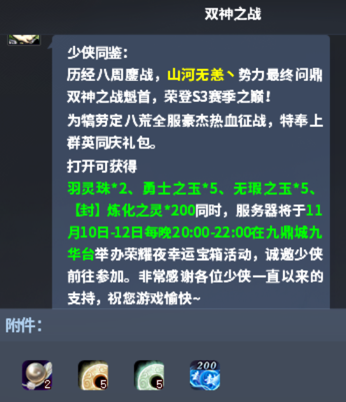 各位少侠晚上好呀! 持续激情了两个月的第三赛季【定八荒】正式落下帷幕,恭喜来自共工阵营的【山河无恙丶】势力最终问鼎双神之战魁首,成为本赛季的冠军! 八周鏖战的时光转瞬即逝,感谢每位前往赛季服战出风采、共创激情时刻的少侠,我们为大家准备了群英同庆礼包。少侠们别忘了上线领取奖励邮件哦~ 属于赛季服的激情虽然暂告一段落,但属于天下的热血征程仍在继续,新的辉煌篇章待你续写! 听到新赛事将启,屏幕前的你是不是也开始期待了呢?事不宜迟,赶快下滑解锁更多资讯吧! 赛事资讯抢先看,做好准备热血开战! 自本周更新后开始,一直持续至12月2日,每周为一个赛季,其中,11月26日-12月2日为决胜赛季。 本次赛事我们以等级生态大区为分区,核心都只做一个服——非神启服的6个服务器(飞鸿踏雪、笑看风云、逍遥三界、再战今朝、戮力同心、天荒地老),将正常开启单服赛事;而神启服的赛事,仅在飞龙在天服务器开启。岁末将至,我们希望给大家带来神启2025年最后的一次服务器战事狂欢! 赛事期间,少侠们参与流光梦境、世界首领旱魃争夺战、势力战、新梦源城战,每造成伤害、治疗或承伤时,均可以获得征战四方声望。 赛事奖励曝光,海量珍稀道具等你赢! 胜者为王,冠军势力独享多重特权! 本次征战四方赛事【飞龙在天】服务器的冠军势力,将享有对服务器的更名权,可以从2025年9月已合并服务器名以及荣耀大荒大区曾经存在的任一服务器中任选。 不仅如此,该服务器中的获胜势力,还能对神石进行定制,让西陵皇城中的传送神石变成特殊的模样,以更显眼的形式向全大荒昭告这份荣耀! 当然咯,还有大家最关注定制武魂,本次赛事的所有服务器(飞龙在天、飞鸿踏雪、笑看风云、逍遥三界、再战今朝、戮力同心、天荒地老)的冠军势力,都享有定制武魂的特权。届时,冠军势力的成员们就可以手握拥有自家势力特色的武魂闯荡大荒啦~ 除此之外,各服务器冠军势力的势力主和执金侯,都能获得荣膺翅膀作为奖励,让这般承载特殊荣誉的羽翼,向天下少侠昭告你在这次赛事中的卓著功绩! 同心共战,这份势力荣耀与你有关! 前面已经提到,征战四方的赛事期间,将按周分为三个赛季,前两赛季奖励一致,第三赛季即决胜赛季的奖励会更丰厚。在各个服务器中,前10名势力可获得奖励。同时,势力内可获取奖励分为势力主礼包、执金侯礼包、核心礼包、精英礼包。 注:以下奖励仅作前瞻性爆料,详细奖励情况可见更新公告 飞龙在天 作为本次神启服务器中的唯一开启赛事的服务器,想必届时会有大量少侠涌入,参与其中,因此,我们也为这个服务器中前10名势力准备了丰厚的奖励。 在最终赛季中,冠军势力的执金侯礼包中,包含了神来之笔·捌、万灵汇珍品宝匣、军饷券10000、天璇·玖、帝释溟钻等奖励;而势力主则同样享有帝释溟钻、天璇·玖,更是加码了天书属性固增道具、神来之笔·玖、大荒豪杰召集令等珍贵道具! 我们为2-4名势力的势力主准备了帝释溟钻、神来之笔·柒、军饷券、盈福经验丹·究等好礼,2-4名势力的执金侯礼包内,则包含了红钻、军饷券等奖励! 飞鸿踏雪、笑看风云 逍遥三界 本次在这三个服务器的势力奖励中,我们特别投放了一系列直升奖励,包括等级直升·天魂陆天玖境界、满级灵兽直升丹、满级觉醒直升丹等!在最终的决胜赛季中获得冠军的势力,势力主和执金侯开启礼包就能获得,帮助少侠探寻新的巅峰! 除了上文提到的系列直升道具,冠军势力的势力主还可以获得神来之笔·捌、五帝本纪等奖励,执金侯则可以获得天璇·玖、万灵汇珍品宝匣等;亚军势力的势力主可以获得通天鉴地宝匣、逆天玉等,执金侯则可以带走红莲溟钻、神来之笔·柒等;季军势力的势力主,则享有红莲溟钻、炼化之灵、战场声望等奖励! 戮力同心、再战今朝 在决胜赛季中,我们为冠军势力的势力主准备了神来之笔·捌、五帝本纪、盈福经验丹等奖励,为冠军势力的执金侯准备了神来之笔·柒、五帝本纪、盈福经验丹等好礼。亚军势力的势力主可获得通天鉴地宝匣、神来之笔·柒等奖励,季军势力的势力主可带走红莲溟钻、炼化之灵、战场声望等好礼。 天荒地老 在决胜赛季中,冠军势力势力主和执金侯的礼包、亚军和季军势力的势力主礼包,加码了势力副手·缈礼盒、炼铸石·珍·易、五帝本纪·究等珍稀好礼!4-10名势力的势力主,可以获得雷音溟钻、炼化之灵、盈福经验丹等道具~ 热血当酬,个人凭声望兑换海量养成道具! 前面已经提到,飞龙在天服务器将新增征战四方声望,少侠们通过参与战斗,前两周可以获得价值5600元宝声望,最后决胜周更是可以获得价值12200元宝声望! 凭征战四方声望,可以在声望商店内兑换包括帝释溟钻、红莲溟钻、五帝本纪·究/高/中、天璇、尚书令、五彩石、星晖、灵曜石、灵兽经验丹·1500万、炼化之灵在内的海量养成道具,为即将到来的岁末名人堂补充你的弹药! 无限降低打架门槛,战令在手战斗无忧! 为了进一步降低大家的打架门槛,本次飞龙在天专属转入机票【九转乾坤·飞龙在天】折上折,仅售100元宝;飞龙在天的转出机票同样仅售100元宝,让你来去无忧!更有超值战令上线,20倍返利助力战斗无忧! 解锁战令享20倍返利,战备道具助征战! 本周三更新后,征战四方赛事战令将在飞龙在天、飞鸿踏雪、笑看风云、逍遥三界及其他所有神启