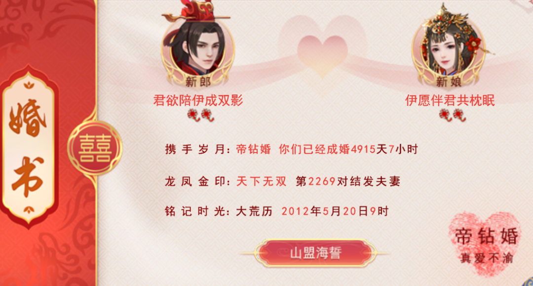今天,我们很荣幸邀请到了在比赛中同样表现精彩的亚军得主【阿花】(李乐意)少侠分享她和大荒的故事。而除了音乐,她在大荒还收获了一段令人羡艳的神仙爱情…… 提起【阿花】的“面基之旅”,竟是在毫不知情的情况下,被朝夕相对的大荒好友堵在了理发店里!而这一次突如其来的奇袭,却正好把她堵在了幸福里面…… 事不宜迟,今天就让我们一边啃着瓜子,一边听听来自【飞鸿踏雪】的【阿花】讲述她与【熊哥】如戏一般的爱情故事吧~ 超绝大型古风网游,一入坑就是一辈子 时间回到2011年,与舍友在学校附近闲逛的阿花,偶然间发现一家网吧似乎在宣传什么大型古风网游,海报上描绘的国风山水让从未接触过这类游戏的阿花瞬间来了兴趣,当下就与舍友在网吧找了个位置,开启对虚拟新世界的探索。 踏足大荒,阿花化身为济世悬壶的冰心弟子。随着悠悠笛声在耳机响起,阿花也开启了自己的大荒旅程,看不完的风景、品不完的故事、听不厌的BGM……无一不让她打心底里爱上了这个游戏。 阿花喜欢约上朋友们一起看看风景,拍拍照,尽管对游戏玩法还不是很了解,但亲自去探索辽阔的大荒世界,也足以让她乐在其中。 每一次登录游戏,阿花都感觉自己与天下之间的情感加深了一分,虚拟的世界打破了现实的种种桎梏,让她能抛却一切烦恼,只需享受当下的轻松愉悦。 想必阿花也不曾想过,这个虚拟世界有一天也会突破次元壁,改变自己的现实生活…… 我走过最长的路,是你的套路 虽说有着走遍大荒每一个角落的雄心壮志,但连轻功都没有学完的阿花,面对各种崎岖的地形也实在无计可施。无奈,她也只能尽自己所能,走到哪里算哪里。 某日,来到桃李花林的阿花忽然发现了一位弈剑侠客没有踩滑板却在水面踩着走,来去自如,他到底是怎么做到的?这一下子激起了阿花的好奇心。 带着疑问,阿花赶忙冲到岸边,向他虚心请教。这位弈剑看眼前的小白冰心十分诚恳,爽快地开启教学模式。他耐心地讲解操作的步骤,并一次次在水面示范,阿花也跟着步骤操作,但是无论多少次,她都还是沉进了水里。 看着气恼万分的阿花,这位名为【熊哥】的弈剑也非常贴心地安慰着她,甚至答应阿花每天同一时间,都可以来教她。阿花也是越挫越勇,誓要学会这水上漂的技能。 在阿花喝了一个星期的“大荒水”后,她忍不住对熊哥发出了灵魂拷问:“到底是为什么啊,有什么特殊要求吗?”熊哥闻言,似是终于憋不住了哈哈大笑道:“你真逗,我有贰境界蜻蜓点水啊,你没有~”得知真相的阿花霎时火冒三丈,原来有模有样的教学只是想看自己出丑! 不出意外的话,这个时候故事就要发生转折了~ 看着气鼓鼓的阿花,熊哥的目的似乎也达到,随即他立马双手奉上一个蜻蜓点水·贰境界轻功给阿花。领悟蜻蜓点水贰境界后,阿花再次按下空格往水面跳去,这一次她没有掉进水里,一步接着一步,她也终于能在水面来去自如,虽然过程曲折,但也算实现了一周前立下的目标。 一场始料未及“恶作剧”反而让二人成为了好友,阿花的大荒生活也有了新的变化。此后的每天,阿花上线总能收到来自熊哥的刷本邀请。看着在各种副本里带着自己扫荡boss的熊哥,阿花感觉这个当时套路自己还幸灾乐祸的弈剑好像有点不一样,他仿佛在发光,还有点小帅。 除了在游戏里形影不离,两人线下也刚好加了同一个玩家交流群,平时也保持着联系,大荒成为彼此间一个永远也聊不完的话题。而细心的阿花在探究搜索附近人功能的时候,惊奇地发现熊哥赫然在列,原来他就在附近! “这不得见一见?我倒要看看他到底会不会蜻蜓点水!” 心里美滋滋准备制定生平第一次“面基”计划的阿花却怎么也没想到,自己已经掉进了一个蓄谋已久的爱情陷阱里。 天下掉下个俏郎君,初见竟被堵在理发店? 2011年11月29日,刚在理发店理完头发的阿花就被一陌生男子拦住了去路,还没等她发问,眼前的男子就说出了她的游戏ID,听到这阿花的大脑瞬间宕机了,这人该不会是……还没等她反应过来,那名男子就已经帮她结了账往门外走去,阿花也赶忙跟了上去。一路上她反复思考,终于确认自己眼前的人正是熊哥! 见对方终于认出了自己,熊哥如“阴谋”得逞一般笑得更欢了,就好像当初学轻功时告知阿花真相那般。没想到,线下见面也被对方抢先一步,扳回一城的计划再次落空。虽然“心有不甘”,但面对这天降熊哥,阿花却有一种说不出的高兴。 不知是出于信任,还是出于习惯,现实世界里的阿花也乖巧地跟在熊哥身后。过马路时,熊哥忽然拉起了阿花的手,像是下意识想保护她。那一瞬间,阿花听到了自己加速的心跳声…… 这一次,他们的目的地不是副本,而是熊哥学校的食堂,尽管在线上聊得十分投机,但第一次在现实中相见,刚开始难免会有些局促。当话题切换到大荒时,两人之间的尴尬瞬间烟消云散,都开始侃侃而谈,第一次见面,也算是圆满落幕了。 第二天,看到室友手里抱着一堆来自熊哥的零食,阿花瞬间就明白自己的行踪是如何暴露的,仅是一袋零食自己就被“卖了”。 在接下来的日子里,虽然熊哥没有明确说出自己的心意,但是他一直在用行动向阿花表达自己心中的情感:在大荒里为阿花遮风挡雨,每天带她下各种副本,陪她去任何她想去的地方;在现实里,课余时间会约阿花一起吃饭,逛街。在这日复一日的相处下,两人之间的爱情之花渐渐萌芽了