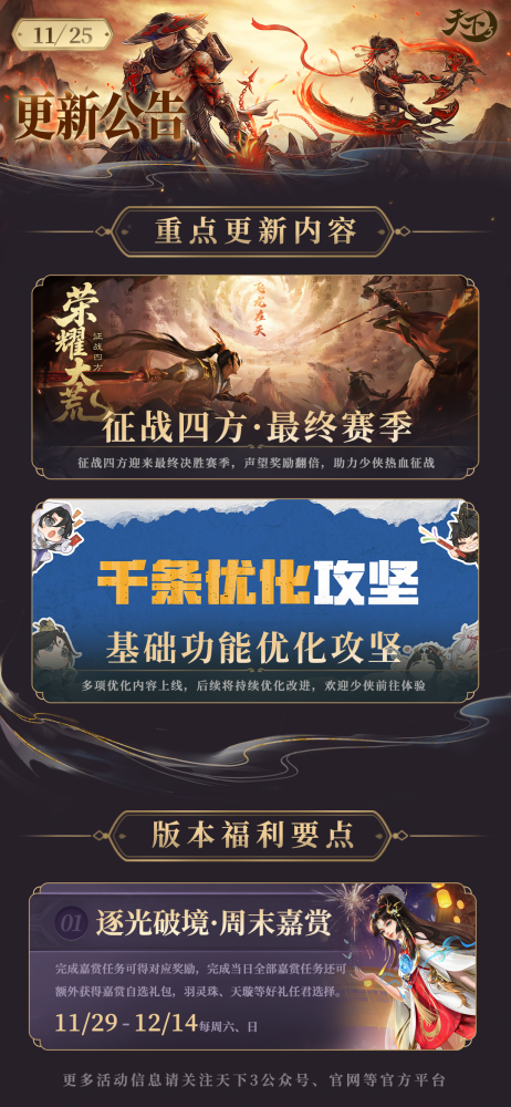 少侠们好呀! 本周将迎来征战四方·荣耀大荒的最终赛季 本赛季飞龙在天服务器内 参与各活动奖励翻倍 具体翻倍规则可查看完整公告哦~ 除此之外,周末嘉赏活动上线 完成活动就能带走太初原石 全部完成还能获得嘉赏自选礼包! 想知道更多更新内容? 赶快下滑看看本周的要点吧! 本周的更新要点到此结束~ 以下为本周公告的全部内容 具体请以官网更新内容为准 亲爱的《天下3》玩家: 为了保证服务器的稳定和服务质量,本周例行维护将于2025年11月26日早上8:00停机,维护时间为上午8:00至10:00左右。如果在维护期间无法完成维护内容,开机时间将继续顺延。 本次更新结束后,游戏客户端版本将从2.0.1329上升到2.0.1330,更新客户端后进入游戏。请各位玩家相互转告,并留意游戏时间,以免造成不必要的损失。对于停机期间给玩家带来的不便,敬请见谅,网易游戏感谢所有玩家的支持和配合。 本周更新小结 活动玩法 1、征战四方·荣耀大荒迎来最终决胜赛季! 2、商城年卡页签上新投壶周卡! 3、逐光破境·周末嘉赏活动开启! 4、推出黑话解答系统! 调整与优化 1、基础功能优化攻坚第二轮开启。 2、逐光破境活动的交换碎片界面进行优化。 3、定八荒服务器的少侠将可以在声望-逐光-逐光破境页签将英魂溟破丹·高或对应储备声望换成大禹之恩声望。 征战四方·最终赛季 征战四方·荣耀大荒第二赛季结束,恭喜在本赛季获得冠军的服务器霸主们:镇系-飞龙在天、旌旗十万斩阎罗-烟花三月、悠然-飞鸿踏雪、那我走-笑看风云、夙愿-逍遥三界! 本周更新后,征战四方·荣耀大荒迎来最终决胜赛季! 奖励翻倍 决胜最终赛季,参与飞龙在天服务器每日计分的流光梦境,每日最多可以获得2000征战四方声望;参与势力战,每日最多可以获得3600征战四方声望;参与梦源城战,最多可以获得4000征战四方声望。(世界首领旱魃争夺的日上限仍为800声望,请知悉。) 夫妻/同袍转服优化 本周更新后,我们将支持夫妻/同袍转服时,两个人分别携带通用九转乾坤机票,也可以正常转服,不需要再将机票集中在一个人身上。 逐光破境·投壶周卡 活动期间商城年卡页签上新投壶周卡!总共上架三周,早买早赚! 活动时间:2025.11.26更新后-2025.12.17更新前 活动内容: 1、少侠可在商城通过首页推荐和点击年卡标签两种形式进入投壶周卡购买界面,共有投壶周卡和进阶投壶周卡两种可供少侠选择 2、少侠购买后,即可获得立得奖励和购买当日的每日奖励。每日奖励每日8:00刷新 3、投壶周卡立得奖励:680军饷、200元宝折扣券*1(满1000元宝可用);周卡每日奖励:限时风雅颂(30) 4、进阶投壶周卡立得奖励:680军饷、限时风雅颂(680)200元宝折扣券*3(满1000元宝可用);进阶投壶周卡每日奖励:限时风雅颂(500) 5、少侠在活动期内,可通过补差价的形式,将购买的投壶周卡升级为进阶投壶周卡,奖励将会折算后一起补发给您。少侠升级补差时,将会结算所有购买过的投壶周卡,一并补差返还给少侠 注:周卡附带的声望为限时风雅颂声望,将会在12.17日更新后清空,请少侠注意及时使用,不要过期了哦~ 特殊说明:少侠在11.26日更新当天23:59之前,可购买3张投壶周卡,错过当天,则只能购买2张周卡,以此类推。活动最后一周不可购买周卡,只能领取周卡奖励,请少侠注意 基础功能优化攻坚 本次更新后,以下优化内容将逐一实装,愿能助少侠们的大荒之路更为顺心遂意。 1,优化了修炼势力技能时的按钮显示规则; 2,优化了玉狐宫·噩梦无法使用卡住脱离的功能 3,衣橱增加双人动作筛选选项 4,衣橱增加多人珍兽筛选选项 5,更多普通副本支持副本天赋 6,山河策增加了自动报名功能 7,新增部分声望道具可批量使用 8,喂养孩子道具支持右键打开孩子界面 9,金焕焕处过期道具提前提醒 10,五行盘支持叠加 11,大荒巡游兑换的五帝本纪·中支持叠加+瞬间开启 12,烟花、五彩石等道具叠加上限增加 13,神祝道具描述优化 14,优化了使用部分道具自动下马的情况 15,天通之途奖励支持一键领取 16,鸿福鸿运右键可打开对应课程表进行寻路 17,下架了活动日程中部分过期活动 18,增加了势力大事记查看详情按钮 19,优化了衣柜时装排序逻辑 逐光破境·周末嘉赏 11月29日至12月14日期间的每个周六和周日都可完成嘉赏任务,获得对应奖励,完成全部每日嘉赏任务还可额外获得嘉赏自选礼包! 活动期间每日完成以上所有活动,可获得嘉赏自选礼包,使用后可在以下七种道具中选择一种获得:【禁】羽灵珠*4、【禁】五帝本纪·高*10、【禁】通鉴符·高*3、【禁】天璇*10、【禁】尚书令*10、【禁】乾元之气*10、【禁】草精七彩果*10。 资源优化 尊敬的少侠,本周更新时,会为天府之国服务器进行硬件升级,服务器开服时间预计延后30~60分钟。 体验优化 1、本周更新后,将会推出黑话解答系统,点击聊天频道标有下划线的词语可跳转至精灵处解答。 2、本周更新后,少侠将能在逐光破境活动的交换碎片界面内直接查看所有玩家在一小时内发布的交换信息,并通过点击交换信息弹出交换界面的方式进行破境道具的快捷交换啦! 世界相关 1、本周更新后,定八荒服务器的少侠将可以在声望-逐光-逐光破境页签将英魂溟破丹·高或对应储备声望换成大禹之恩声望了。 2、本周更新后,赛季服定八荒的双神之战的活动界面将关闭,包括领奖功能以及声望兑换商店都会关闭。而在本赛季获得的双神声