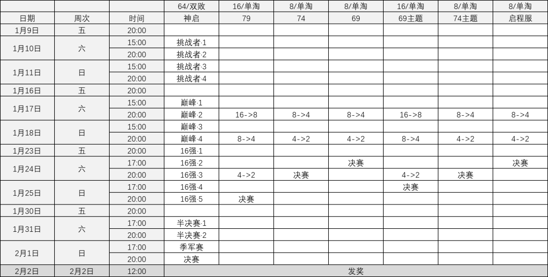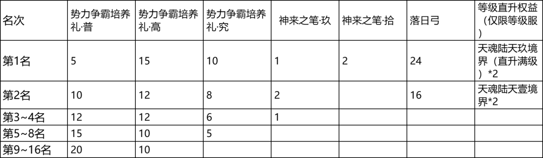 一转眼,“问鼎天下”年度评选就进入了尾声,名人堂评比、十多项排行榜单迎来最后的冲榜、守榜时刻。今年少侠们都奋战在什么赛道,为自己争夺丰厚的外观、道具奖励呢? 属于大荒的精彩自然不会就此停歇,今日更新后,2026年度岁末演兵报名正式开启,本次报名将持续至2026年1月7日7点30分,有足够的时间供大家排兵布阵和报名,想要参与其中的势力可千万别错过~无论是参与势力争霸,还是围观支持参赛势力,都将获得海量丰厚奖励! 赛事规则早知道,排兵布阵更合理! 本次势力争霸赛,分为神启等级段、75-79等级段、70-74等级段、59~69等级段、69主题服、74主题服、启程服,共7个等级段的势力争霸赛。报名时间为12月24日更新后-2026年1月7日7:30,3级势力可以报名参战,但每个势力最多报名一支队伍。 报名截止时,将根据报名势力参赛名单中所有玩家的总修为(包括人物修为、装备评价)进行排序,不同等级段入围比赛的名额如下: 本届势力争霸神启等级段将启用全新赛制,在报名阶段,将分为4+8+64的模式。其中,“4”指的是,在2025年度岁中赛中获取前四名势力【征戰、镇山、戰月、清和】将直接保送本届势力争霸16强。但需要注意的是,保送势力仍需报名,进行修为统计和人员录入,如超时未报名或修为排名过低,将被取消保送资格,保送资格将由修为排名高的势力顺位代替。 而“8”指的是根据所有势力参赛名单中所有玩家的总修为,取前8名直接进入巅峰小组;“64”指的则是总修为排名9-72的势力,进入挑战者小组。 本次比赛BO3的三场战场分别为:[新]江南雪竹阵、巴蜀演兵场、江南雪竹阵。将针对不同等级段限制某些门派单阵营入场最大人数,超出时,所有该门派玩家将全属性-5%。因此大家在斟酌阵容的时候,要综合考虑上述的限制。 此外,小天天还为大家带来了详细的赛程安排,少侠们不妨多多留意一下~ 赛事奖励抢先看,海量珍稀道具带回家! 实体奖励彰显身份之尊 更有高价值道具加码 今年,依然有一座分量十足的“烛龙之征”奖杯已为大家备下,它将属于神启等级段的冠军势力!烛龙盘踞,祥云托举,唯有这般霸气的奖杯,方能与最强者相配! 不仅如此,6个等级段所有冠军势力参赛成员,将获得实体定制摆件【烛龙之征·摆件】和官方认证定制冠军证书【烛龙之征·证书】,记录势力团队荣耀! 在此之余,我们也为各等级段的冠军势力,准备了专属的势力驻地天空盒和势力底板标识,将冠军荣光带入势力驻地内,让大家每一次进入自家驻地都能回忆起这个共同铸就的荣耀时刻~ 根据各大势力在己方所属赛区的排名,团队可以获得势力可分配奖励,用于分配给势力成员名单内的少侠。而参赛的少侠也将根据势力争霸排名获得对应的个人奖励。 团队可分配奖励 神启赛区,前16强势力能获得势力可分配奖励,包括培养礼·高、究,内含大禹神砂自选、南海神砂·究/北溟神砂·高(二选一)、【天魂】丹青仙聿、【至尊】天魂模具等。四强战队还额外获得神来之笔·玖、落日弓(可使用该道具对部分可升阶的击杀印记进行升阶,升阶后可获得等多击杀效果),前2名势力可额外获得珍稀道具神来之笔·拾! 神启势力争霸培养礼 神启赛区在挑战者赛阶段、巅峰赛阶段,根据小组排名也能获得势力争霸培养礼。 小组赛势力争霸培养礼 在挑战者赛阶段,前3名势力将晋级至巅峰赛区,争夺更丰厚的巅峰赛段奖励。4-8名势力根据排名可以获得若干培养礼,6强势力可加码获得培养礼·究、神来之笔·陆! 在巅峰赛段取得前3名的势力可以晋级16强队伍,争夺前文提到的顶尖奖励。而第四-第八名的势力,则可以获得若干培养礼,内含五帝本纪·究、通鉴符·究等,此外,还能获得神来之笔·柒作为奖励~ 在69/74/79等级段、69/74主题服内,我们为16强势力准备了好礼,四强势力加码获得神来之笔·玖,前2名势力额外获得落日弓、等级直升权益(仅限等级服),冠军势力将独占珍稀道具神来之笔·拾! 等级服/主题服势力争霸培养礼 启程服赛区的八强势力,将获得对应的培养礼奖励,内含五帝本纪·高*100/神来之笔·陆、封·雷音溟钻等好礼,四强势力加码获得神来之笔·柒,前两名势力还能额外获得落日弓。 启程服势力争霸培养礼 个人道具奖励 为了更好地犒劳每位全情参与其中的少侠,参赛成员个人,根据势力争霸的排名,也有对应的奖励哦~ 神启等级段,16强势力的参赛成员们都能获得限定称谓、五帝本纪·究、势力争霸大红包;8强势力的少侠可额外获得限定击杀印记【烛龙擎天】,第一名势力的少侠更可获得永久的岁末好友卡片和举杯待机动作,彰显身份之尊! 69/74/79等级段、69/74主题服的16强势力参赛成员,均可带走五帝本纪·究,8强势力的少侠可额外获得限定称谓、势力争霸大红包;四强势力少侠可额外获得限定击杀印记【烛龙擎天】,第一名势力的少侠更可获得永久的岁末好友卡片和举杯待机动作~ 启程服的8强势力参赛成员,都能获得限定称谓、五帝本纪·高、势力争霸大红包;4强势力的少侠可额外获得限定击杀印记【烛龙擎天】,第一名势力的少侠还能带走永久的岁末好友卡片和举杯待机动作哦! 年度MVP奖励 值得一提的是,今年还新增了年度MVP奖励——赛事组将根据比赛的数据和表现,评选年度MVP,鼓励少侠们在赛事中拼尽全力,为自家势力争取更优异的成绩~被评为年度MVP的少侠,可以将海量限定奖励带回家:落日弓*3