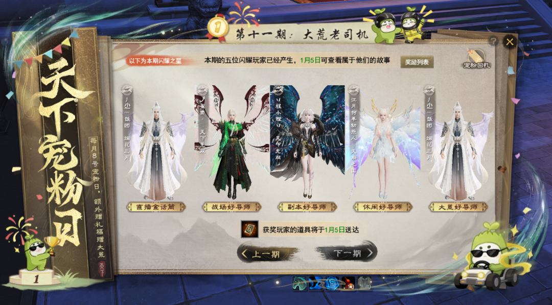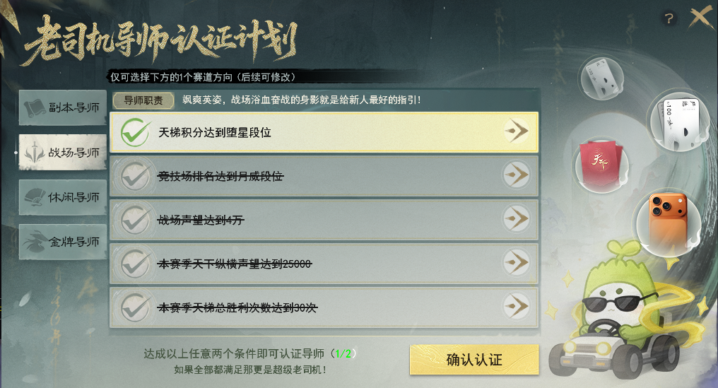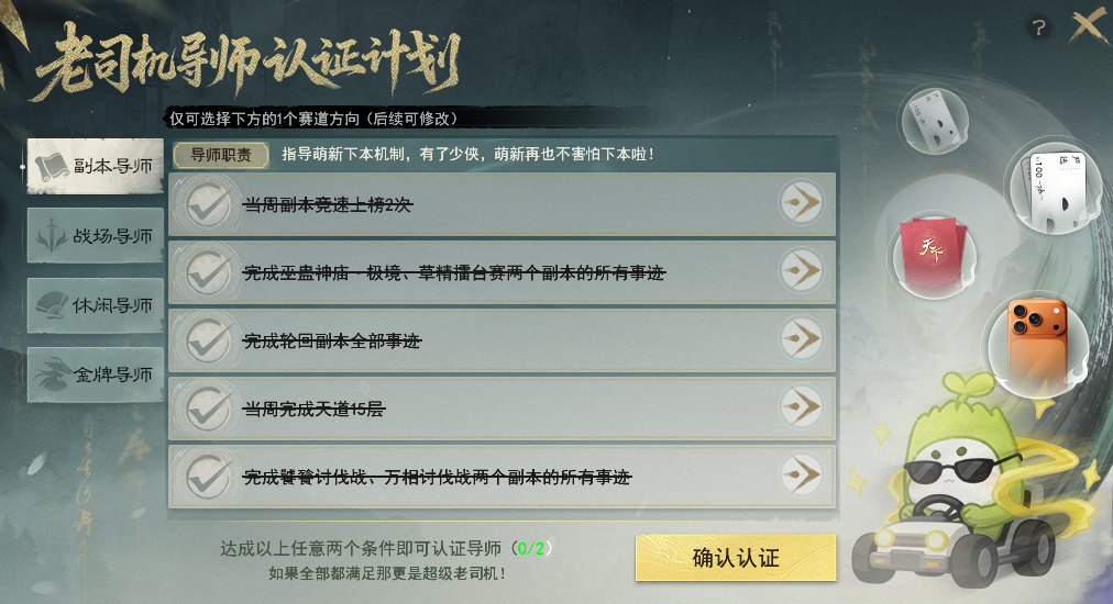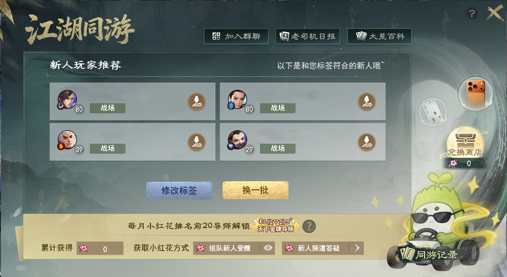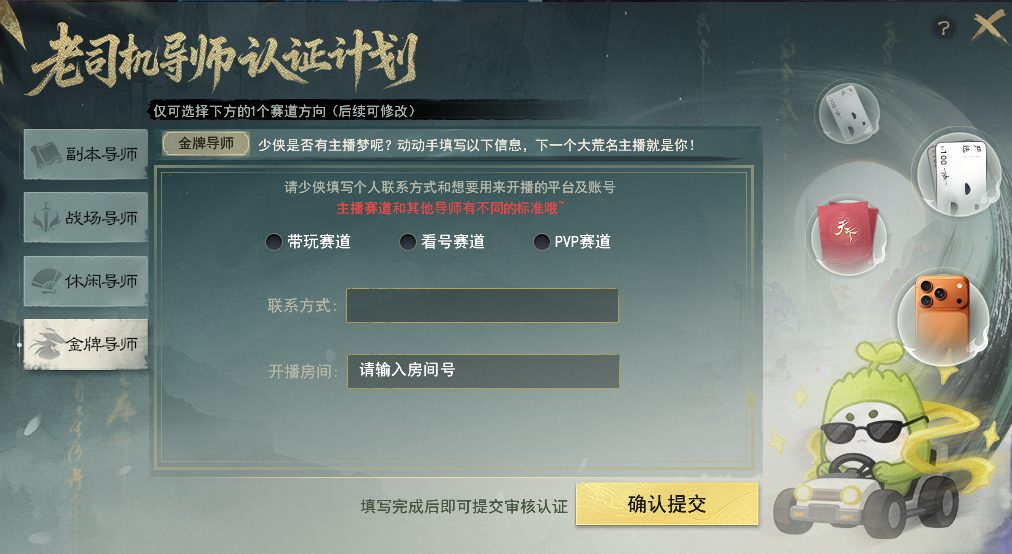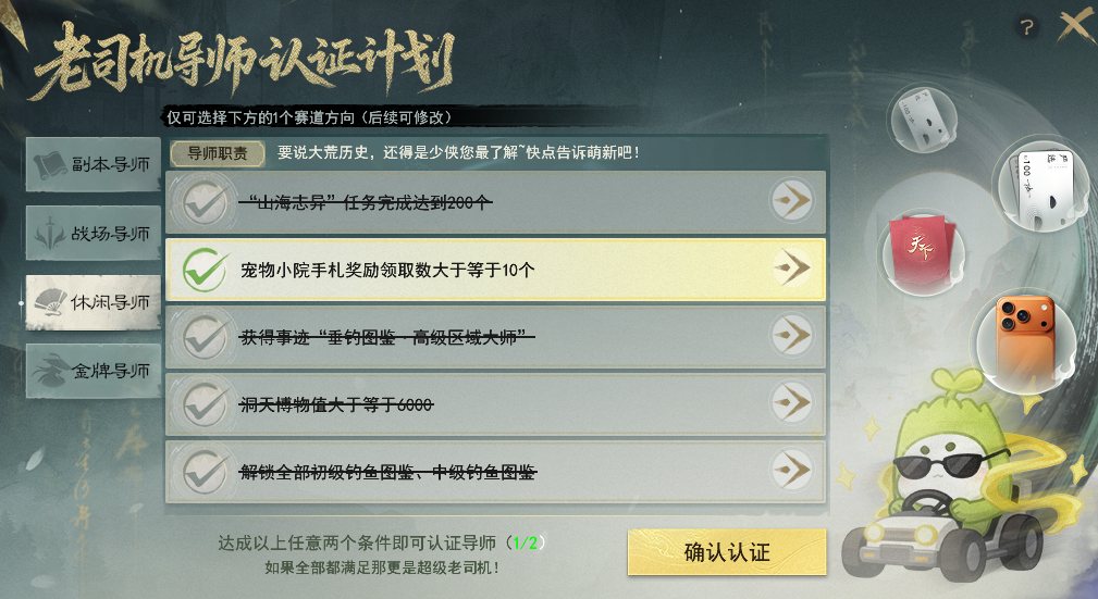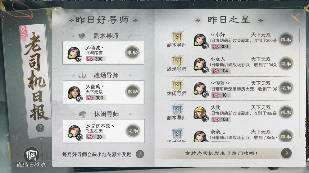 认证专属导师带萌新 带走iPhone等豪华大礼! 【导师认证】玩法为邀请制,暂不开放自主报名方式,积极参与副本、战场、休闲等各类玩法并有所建树的少侠有几率收到导师认证的邀请哟~ 暂未收到认证邀请的少侠,不妨继续深耕各类玩法,说不定不久后就成为大荒认证的老司机啦~ 收到认证邀请的少侠可以点击游戏界面右上角的【导师认证】按钮进入活动界面。 也可以通过活动日程表-节日,点击前往打开活动界面。 目前设有副本、战场、休闲以及主播专属四类赛道的导师。其中,主播赛道需要提交相关资料等待审核,而副本、战场以及休闲三大赛道,只需要达成各赛道中任意两个条件,即可成功认证导师,并生成专属头衔~ 上下滑动查看更多图片 认证成功后,系统将会根据少侠选择的标签,推荐与你趣味相投的新人,少侠可以选择添加好友共游大荒,若想换个深耕方向,也可以随时选择更换标签哟~ 导师少侠可以通过全服新人频道为各位萌新提供文字指导、或是更直接的组队带玩形式,帮助萌新少侠更快融入大荒世界。 萌新/回归少侠也可以通过右上角进入活动界面,选择适合自己的标签,同样会生成专属的头衔,系统将会根据你的选择为你匹配合适的导师,助你畅游大荒! 若是想先自行探索,也可以点击右上角的【大荒百科】获取各种玩法的攻略,闯荡大荒更轻松~ 初次点入活动界面即可获得小红花声望道具*10,右键使用后可储存为能赠送给导师的小红花。 后续可通过完成诗与酒、宝鉴、大荒美食谱、通关幽谷鬼狱、完成战场·铁蹄获得小红花声望道具,每日最多可获得10朵。 如果你的身边,或是在全服新人频道内遇到可靠的导师,那么就可以在组队状态下面对面、或是在新人频道中右键导师的名字为他送上小红花点赞! 除了系统匹配的导师以外,大家还可以通过点击活动界面的【老司机日报】查看荣获昨日好导师或是昨日之星的热心少侠,以便新人少侠可以一键向老司机求助哟~ 同时,还有主播助力!点击左下角的直播日程,就可以快速查看所有主播的排班日程表,高效观看直播不跑空~ 若是碰到靠谱的导师,不要忘了为他们送上一朵小红花以示感谢哟~ 收到小红花的导师少侠,就可以在导师专属的声望商店中,兑换iPhone、网易严选卡、实物周边等超值好礼! 每月1日的早上8点,会为结算时不同领域排名第一的导师发放额外的小红花奖励,每月获得小红花声望最多的前20名导师还可以获得天下金牌导师的头衔,并成为本月的新人频道管理员。 管理员可以协助管理新人频道,当看到在新人频道内有不良言论时,可及时将发布不良言论的少侠请离频道半个小时,为大家打造一个良好交流环境~ 相信有各位导师少侠的热情带玩 无论你是萌新少侠 抑或是阔别多年想回归大荒的老朋友 都能顺利融入大荒世界 收获属于自己的欢乐时光 与此同时,为了进一步感谢各位导师少侠 我们将本期天下宠粉日的主题 设定为“大荒老司机” 将过去一段时间各类赛道中 收获小红花数量最多的少侠 为本期的闪耀之星 他们不仅在擅长的领域有所成就 更有一颗乐于助人之心 颇有“达则兼济天下”的气魄 大荒的冬日因有他们的无私与热心 而变得格外温暖 一起跟随镜头,欣赏一下他们的身姿吧~ [编辑:月光下完美]
