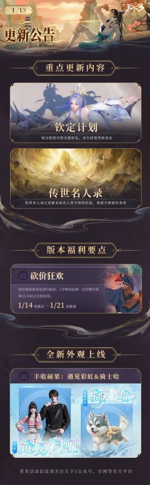本周的更新要点到此结束~ 下滑解锁更多详情细节 以下为本周公告的全部内容 具体请以官网更新内容为准 亲爱的《天下3》玩家: 为了保证服务器的稳定和服务质量,本周例行维护将于2026年1月14日早上8:00停机,维护时间为上午8:00至10:00左右。如果在维护期间无法完成维护内容,开机时间将继续顺延。 本次更新结束后,游戏客户端版本将从2.0.1341上升到2.0.1342,更新客户端后进入游戏。请各位玩家相互转告,并留意游戏时间,以免造成不必要的损失。对于停机期间给玩家带来的不便,敬请见谅,网易游戏感谢所有玩家的支持和配合。 本周更新小结 活动玩法 1、钦定计划开启。 2、雪映长歌·丰收硕果、砍价狂欢活动开启。 3、传世名人录更新本届的名人堂少侠信息 。 调整与优化 1、弱水三千和昆仑变服务器优化了赛季元魂珠专属冲刺技能缩地无影的手感 。 2、弱水三千和昆仑变以及赛季服定山河的流光梦境将无法进行元魂珠幻化 。 3、弱水三千和昆仑变服务器,天阶秘境新增副本:古八阵图·冲虚。 4、修复了流光城战开战期间可以拾取流光谍报的问题。 5、调整了掉落包裹的问题,新增临时掉落包裹进行存储 。 6、双神之战阵营系统将增加【双神援兵】。 天下·万象端相关 1、通过主界面上方及战场列表进入本服战场巴蜀演兵场及江南雪竹阵时,将直接传送进入战场 钦定计划 新一期时装投票升级永久活动来了!少侠们可以为自己想要升级永久的时装投票。 活动限制:需要等级>=30、装评>=40000、修为>=20000、风华值>=1000这四个条件才可投票。 活动内容: 投票期时间: 1月14日更新后-1月18日23:59:59,每天首次投票成功后可以获得宝箱奖励!玩家的风华值不同,每天所拥有的票数也将不同。投票时间结束时得票最多的时装将在公示期开始以后变为可升级永久。 本次提名时装为:遥带紫棠、鹊影碧竹、琼台清辉、暮蝶泪空、水玉流波以及春暖屠酥。 公示期时间: 2026年1月21日更新后-2026年1月27日更新前,公示期持续期间,玩家可以前往钦定计划页面查看各个时装的得票数,并且得票第一的时装将变为可升级永久的时装,得票第一的时装在以后均可以升级永久,并不限于钦定计划活动时间内。 雪映长歌·丰收硕果 活动时间:2026年1月14日更新后-1月28日更新前 活动规则: 果树上每层都有若干奖励道具 使用捕梦网道具可以摘取果树上的果子,果子分为金梦果和醉梦果 每次摘取后可以从该层剩下的果子里继续摘取 本层的果子摘取完毕后才可摘取下一层的果子 如果摘取到金色的金梦果,则可以同时拿完这一层的所有奖励道具,并且进入下一层 活动奖励:遇见彩虹礼盒、骑士哈宝匣、【动态称谓】碧波眠日团·银梭织梦茸 奖励兑换 兑换规则:活动时间内,使用丰收硕果外观兑换券,可在奖励兑换界面(点击丰收硕果界面“奖励兑换”按钮进入)兑换各类外观礼包。 本期修改奖励如下: 本期新增奖励如下: 还可用丰收硕果外观兑换券兑换往期外观。 砍价狂欢 活动时间 2026年1月14日更新后-1月21日更新前 活动内容 活动期间,前往酱油舅舅处进行砍价1分钟内达到一定的次数,就可以获得10-500元宝的折扣券!具体奖励如下: 60次:10元宝折扣券 90次:40元宝折扣券 120次:50元宝折扣券 200次:100元宝折扣券 300次:300元宝折扣券 400次:500元宝折扣券 注: 1、每位玩家参与机会不限,但是只能领取一次奖励,且开始一次新的玩法将视为放弃上一次砍价的结果; 2、每次开启新的玩法会消耗8金; 3、开启玩法需要修为不低于20000; 4、奖励的折扣券仅限2026年1月1日0:00至2026年1月31日23:59期间使用。具体使用条件见道具描述说明。 传世名人录 历届名人堂展示!目前已更新本届的名人堂少侠信息,少侠可通过指令-传世名人录打开查看查看往届名人堂诸神信息、名人堂少侠语录。 体验优化 1、在弱水三千和昆仑变服务器,本周更新后,优化了赛季元魂珠专属冲刺技能缩地无影的手感,大幅缩短了回气和调息时长。 2、本周更新后,修复了流光城站开战期间可以拾取流光谍报的问题。 世界相关 1、包裹满导致物品掉落到地上的设定将进行调整,调整方向:新增临时掉落包裹进行存储,存储时限7天,存储上限192,超过存储时限/上限的物品才会被清除。本周更新后将全服开启此调整,请少侠知悉。 2、本周更新后,年度服弱水三千、昆仑变,以及赛季服定山河的流光梦境将无法进行元魂珠幻化,请各位少侠知悉。 3、在弱水三千和昆仑变服务器,本周更新后天阶秘境新增副本:古八阵图·冲虚,少侠们需要迎接新的挑战。 4、本周更新后,商城热卖区下架道具:仙龙之钥系列道具,请少侠知悉。 5、本周更新后,减价狂欢节活动结束,请各位少侠知悉。 6、本周更新后,双神之战阵营系统将增加【双神援兵】,没有势力的少侠可在加入势力的界面暂时加入祝融/共工阵营的援军,加入援军之后,即可使用阵营模式和参与阵营相关玩法,获得日常的阵营声望奖励。在援军状态下,可自由加入本阵营势力,部分势力战役玩法仍需加入势力后才可参与,例如势力战、城战等。 天下·万象端相关 本周更新后,玩家通过主界面上方及战场列表进入本服战场巴蜀演兵场及江南雪竹阵时,将直接传送进入战场,不再需要再从NPC进入了,和跨服战场流程一致,请各位少侠知悉。 [编辑:月光下完美]