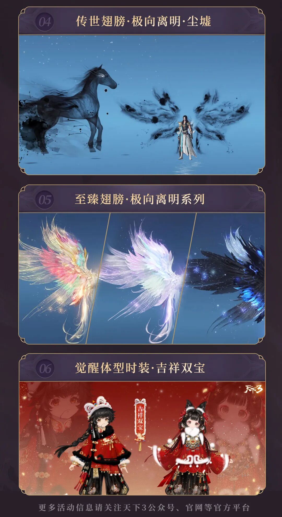 【骏启瑞年】版本正式开启 天下携海量福利好礼邀你共迎新春 更有星运秘宝活动上线 多种外观品类,多样风格任君挑选 三重保障机制让你稳赚~ 想了解本周的更多资讯 可以下滑看看要点图哦! 本周的更新要点到此结束~ [编辑:月光下完美]