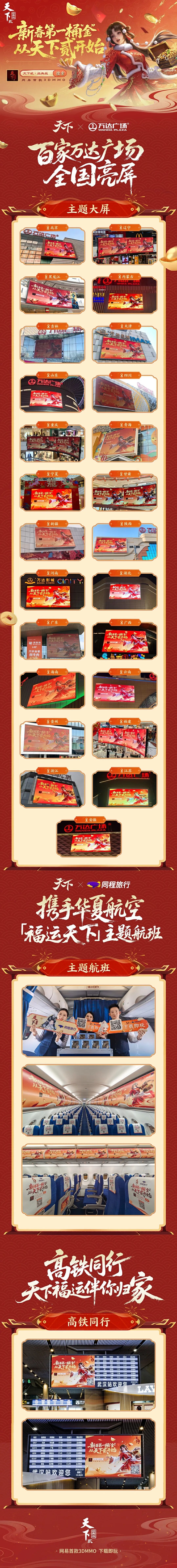 今年,天下迎来了自己的第十八个年头。也因此,在开年之初,我们就用一次全方位刷屏,宣告天下的强势登场! 春节派福全国覆盖,在100座万达广场同步上线,以2026马年天下限定纪念红包,为你送上开年第一份福运! 天下IP×同程旅行×华夏航空共同打造专属「福运天下」主题航班,让万米高空的旅程也能成为天下主场! 我们还在高铁站以大屏画面与你相伴,让福运送你平安归家~ 这个2月,天下以破圈级的曝光量渗透你的每一次出行、每一次驻足、每一次团圆。 天下,在你身边。 ![]() 天下跋涉的漫漫长路,都是在少侠们的陪伴之下一步步走过的,也因此我们产生了更全方位陪伴大家的想法。 天下通过线下派红包活动、主题航班、高铁同行、“2026天下玩家保障计划”等多项内容,将深度陪伴渗透到生活的方方面面,构筑起全方位、多维度的安心守护。 未来,我们也将继续以不同的方式,为大家带来更多深度、全方位的陪伴。 [编辑:月光下完美]
