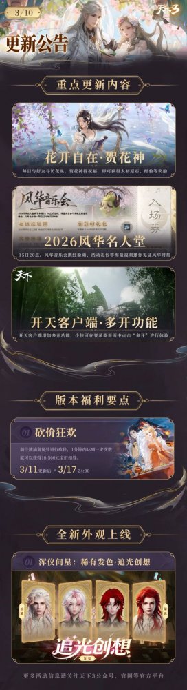 《天下3》开天客户端全面启用,支持多开功能!2026风华名人堂3月15日定榜,在线经验雨、秒杀专场、稀有发色上新,系列福利活动等你参与! 各位少侠晚上好! 2026风华名人堂将于3月15日22时结束 我们为大家准备了一系列定榜活动 欢迎大家积极参与~ 此外,浑仪问星上新稀有发色 活动期间前两次小奇珍必得新头发 十连抽更享折扣,心动的少侠别错过! 想了解本周的更多资讯 可以下滑看看要点图 本周的更新要点到此结束~ 下滑解锁更多详情细节 以下为本周公告的全部内容 具体请以官网更新内容为准 亲爱的《天下3》玩家: 为了保证服务器的稳定和服务质量,本周例行维护将于2026年3月11日早上8:00停机,维护时间为上午8:00至10:00左右。如果在维护期间无法完成维护内容,开机时间将继续顺延。 本次更新结束后,游戏客户端版本将从2.0.1348上升到2.0.1349,更新客户端后进入游戏。请各位玩家相互转告,并留意游戏时间,以免造成不必要的损失。对于停机期间给玩家带来的不便,敬请见谅,网易游戏感谢所有玩家的支持和配合。 更新小结 活动玩法 1、花开自在·贺花神活动开启。 2、2026年风华名人堂定榜。 3、砍价狂欢活动开启。 4、浑仪问星·稀有发色上新。 5、开天客户端·多开功能开启。 调整与优化 1、本周更新后,开天客户端全面替换原有BigWorld客户端。 2、天降鸿福·孩子时装礼盒增加可萃取为羽灵珠。 3、游戏设置-个人设置-战斗显示中新增重击震屏开关。 4、原BigWorld客户端为一档光设置,则登录开天端后会默认开启护眼效果,开天客户端可在系统设置-图形处修改对应设置。 5、全服的中原西陵皇城区神石将会限时6个月替换为征战四方·荣耀大荒的霸主势力征戦的定制神石。 6、飞龙在天服务器将更名为由征战四方·荣耀大荒的霸主势力征戦所指定的瘦西湖。 2026风华名人堂 锦绣天下·定榜活动 锦绣天下·风华名人堂即将于2026年3月15日22时定榜。在定榜前,将有大量的福利派送。 风华定榜之后,风华榜内的排行和数值将不再刷新(风华名片不受影响)。一周之后将重新刷新数据。 定榜奖励将于3月16号12点之后发放。(榜首的雕像和定制权益除外) 【锦绣天下·桃华春时】 2026年3月15日20:00-22:00,将举办定榜活动,欢迎各位少侠前往参与。 1)在线经验雨:当天活动期间,在江南地图即可享受在线经验雨。 2)倒计时礼包:每隔30分钟,当前榜首将为全服派送锦绣天下宝匣。打开宝匣有机会获得:饷银·5000、羽灵珠、称谓升级金券、草精七彩果、王朝军资·1000、太初原石等福利道具。 3)在定榜后,广场大屏下将会伴随桃花雨,掉落锦绣风华宝匣,持续30分钟,打开宝匣可获得珍贵道具 奖池预览:海棠未雨礼盒(可交易)、鹤羽惊风礼盒(可交易)、凛夜化龙礼盒(可交易)、天真烂漫礼盒·觉醒体型(可交易)、桃花一曲礼盒·觉醒体型(可交易)、星辰变礼盒(可交易)、墨灵鹿宝匣(可交易)、镜花水月礼盒(可交易)、小白(饰件)(可交易)、小黑(饰件)(可交易)、草精幻彩叶(可交易)、羽灵珠、称谓升级金券、太初原石等珍稀福利等你来拿!! 4)活动期间,在江南西湖区域,可参与风华音乐会活动,与各位少侠一同见证本年风华时刻。 前往活动会场请开启背景音乐,建议使用开天引擎环境,使用【沉浸模式】体验更佳。 锦绣天下·限时秒杀 2026年3月15日晚,将会开启锦绣天下秒杀专场 20:00:01—20:05:00,称谓升级金券3折,每人限购10个。 20:30:01—20:35:00,羽灵珠3折,每人限购5个。 21:00:01—21:05:00,微步生尘3折,每人限购2个。 21:30:01—21:35:00,焕影溟晶3折,每人限购10个。 22:00:01—22:05:00,万花筒2折,每人限购1个。 花开自在·贺花神 百花生日是良辰,未到花朝一半春。万紫千红披锦绣,尚劳点缀贺花神。 阳春三月,山花烂漫。丹朱书院正在进行贺花神的庆典,相传两情相悦,心有灵犀者一起寻访花丛,便可以获得花神的祝福。 活动时间:2026年3月11日-2026年3月17日 活动地点:苍梧丹朱书院,阿碧 参与条件:30级以上玩家在开天客户端,需双人组队领取,每天可完成1次。 活动奖励:经验、技能点、太初原石*5 砍价狂欢 活动时间 2026年3月11日更新后-3月17日24点 活动内容 活动期间,前往酱油舅舅处进行砍价1分钟内达到一定的次数,就可以获得10-500元宝的折扣券!具体奖励如下: 60次:10元宝折扣券 90次:40元宝折扣券 120次:50元宝折扣券 200次:100元宝折扣券 300次:300元宝折扣券 400次:500元宝折扣券 注: 1、每位玩家参与机会不限,但是只能领取一次奖励,且开始一次新的玩法将视为放弃上一次砍价的结果; 2、每次开启新的玩法会消耗8金; 3、开启玩法需要修为不低于20000; 4、奖励的折扣券仅限2026年3月11日0:00至2026年3月31日23:59期间使用。具体使用条件见道具描述说明。 开天全面启用 自2003年我们引入BigWorld引擎正式开发《天下贰》以来,网易游戏在3D游戏研发的探索已经持续逾20年,《天下》今年也将迎来第十八年头。 BigWorld引擎服役多年,不可否认的是它为大家构筑了一个雄奇壮丽的大荒世界,但随着随着游戏工业发展,这一引擎为少侠们的大荒旅途带来了一些不够理想的体验,对于游戏本身而言,也已经不足以支撑下一阶段的研发,技术上限难以承载未来更丰富的内容构想。 感谢当年BigWorld引擎带天下与诸多少侠相识,一同开启了一场关于山海大荒的旅程。我们想在大荒里种下更多会随风摇曳的花海,想让你在战场里体验到更