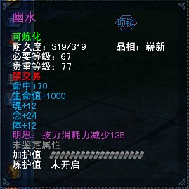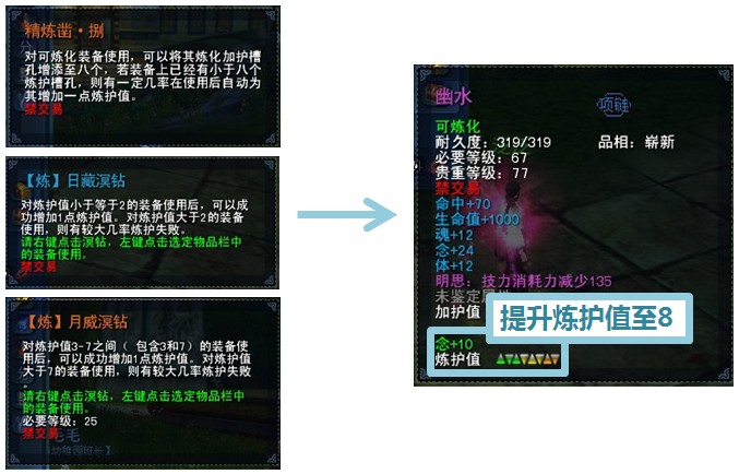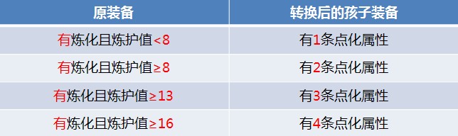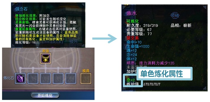 二. 孩子装备制作过程 以古3紫色项链【幽水】为例,图文详解孩子装备制作过程 【第一步】炼化 两点重要原则:1.点化属性的类型和数值是随机生成的 2. 点化属性的条数与原炼化、炼护值有关 温馨提示 1. 点化属性的类型和数值与原炼化属性无关,因此推荐先进行单色低级炼化; 2. 点化属性条数与加护值无关,在简单炼化后只按需求提升炼护值即可,装备加护可先不管 下面是过程举例图解,先单色炼化,小碗随便选了一颗16级的强念石, 然后,假设小碗想要两条点化属性,那么就先把装备的炼护值砸到8, 最后是点化属性条数与原炼化、练护值的详细对照表, 亲们可以根据实际需要去砸炼护值哦,需要注意的是,点化属性条数跟加护值没有关系,没有需求的同学不要误解了